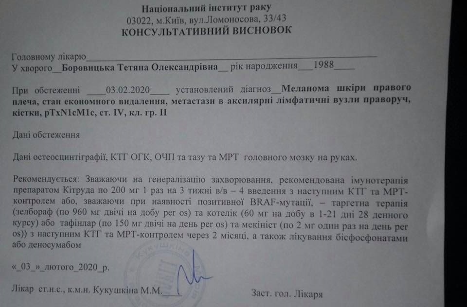 Тетяні лише 31 рік, має молоду родину та виховує маленького сина. В 2020 році їй було діагностовано Меланома шкіри правого плеча, стан економного видалення, метастази в аксилярні лімфатичні вузли праворуч, кістки, pTxN1cM1c, ст. IV, кл. гр. ІІ.
